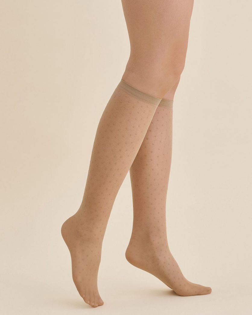 Top quality knee highs with stylish polka dot pattern. 85% polyamide, 15% elastane